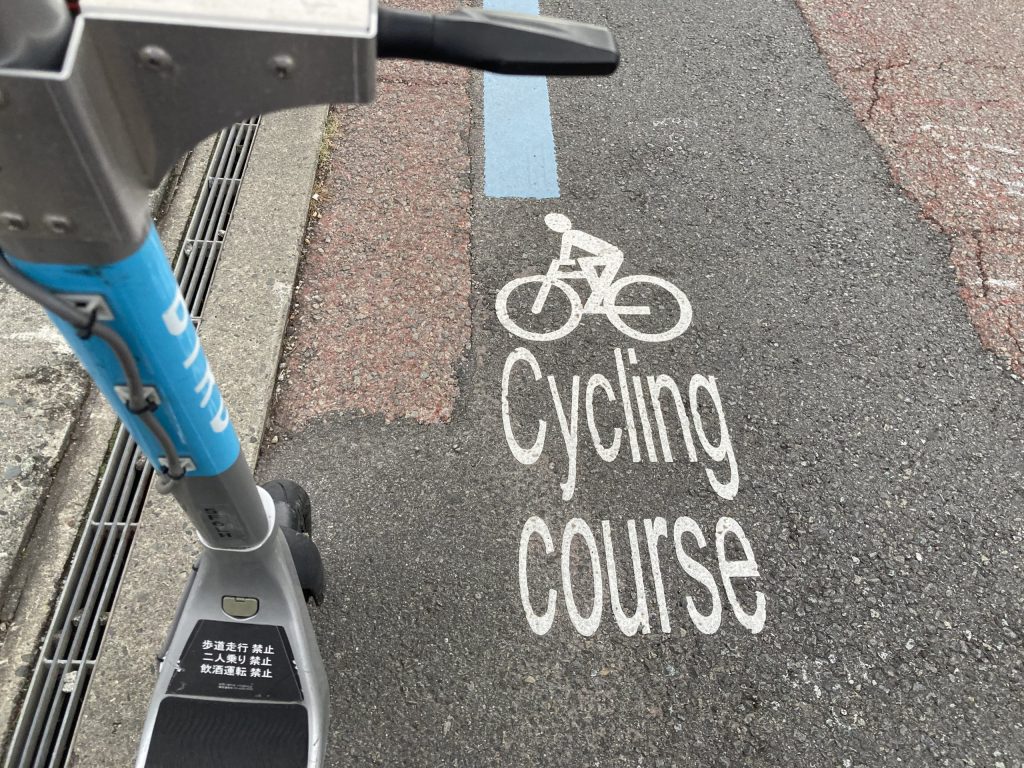 河口湖周辺には、ブルーラインのサイクリングコースが整備されています。景観もよく、はじめて河口湖に来たという方にはおすすめのルートです。電動キックボードなら坂道もスムーズに登ることができました。