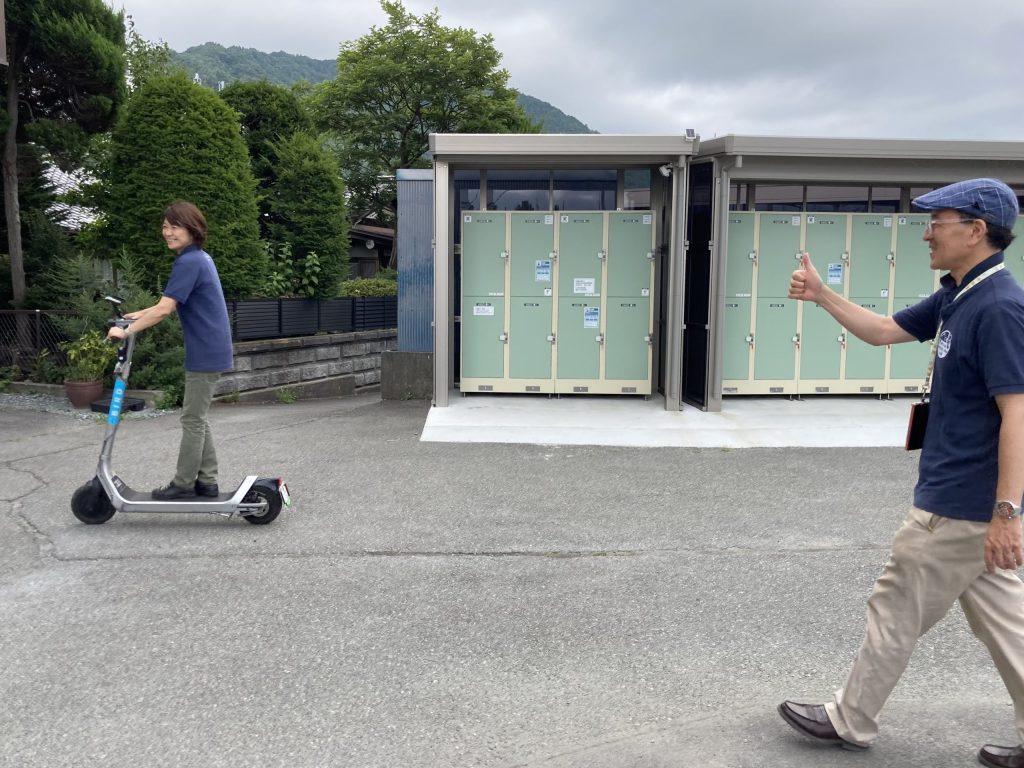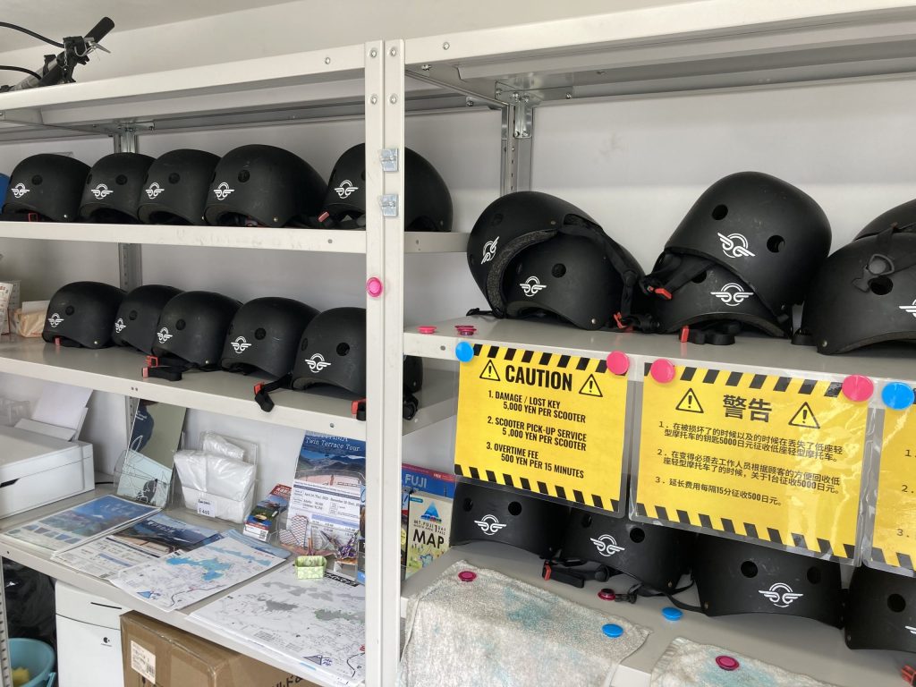 公道に出る前に敷地内のスペースで練習します。初めての方でもコツを掴めばとても便利なモビリティです。ご希望の方にはヘルメットの貸出も行っているので、お気軽にスタッフまでお申し付けください。