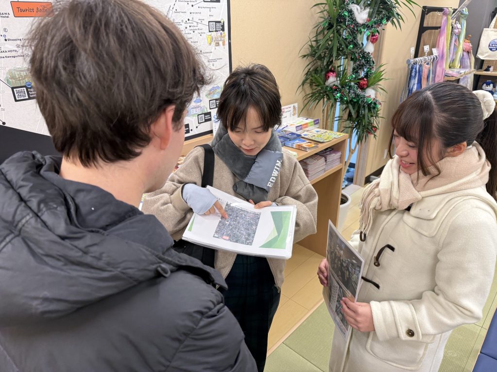 ツーリストベース河口湖に到着したら、3Fのエントランスへ。ツアーの受付を済ませたら、ガイドさんと一緒にスーパーまでのルートを確認します。